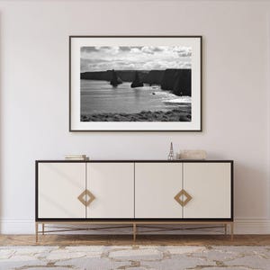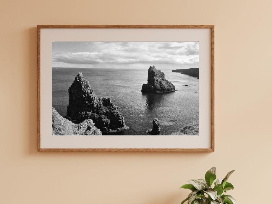 Experience the rugged beauty of Scotland’s northern coast with this striking Duncansby Stacks Print — a high-resolution digital download that captures the dramatic cliffs, towering sea stacks, and timeless power of nature along the Caithness shoreline. Presented in black white print style, this piece blends minimalist decor with the raw elegance of coastal photography, making it a bold addition to any space.