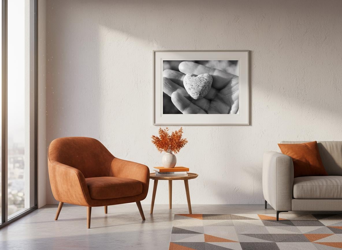 In the hush between tides, where sea meets stone and silence speaks, lies a heart-shaped pebble — worn smooth by time, shaped by the patient rhythm of the coast. Captured in striking black white print, this photograph is not merely an image, but a meditation. A moment held still. A fragment of nature’s quiet grace.